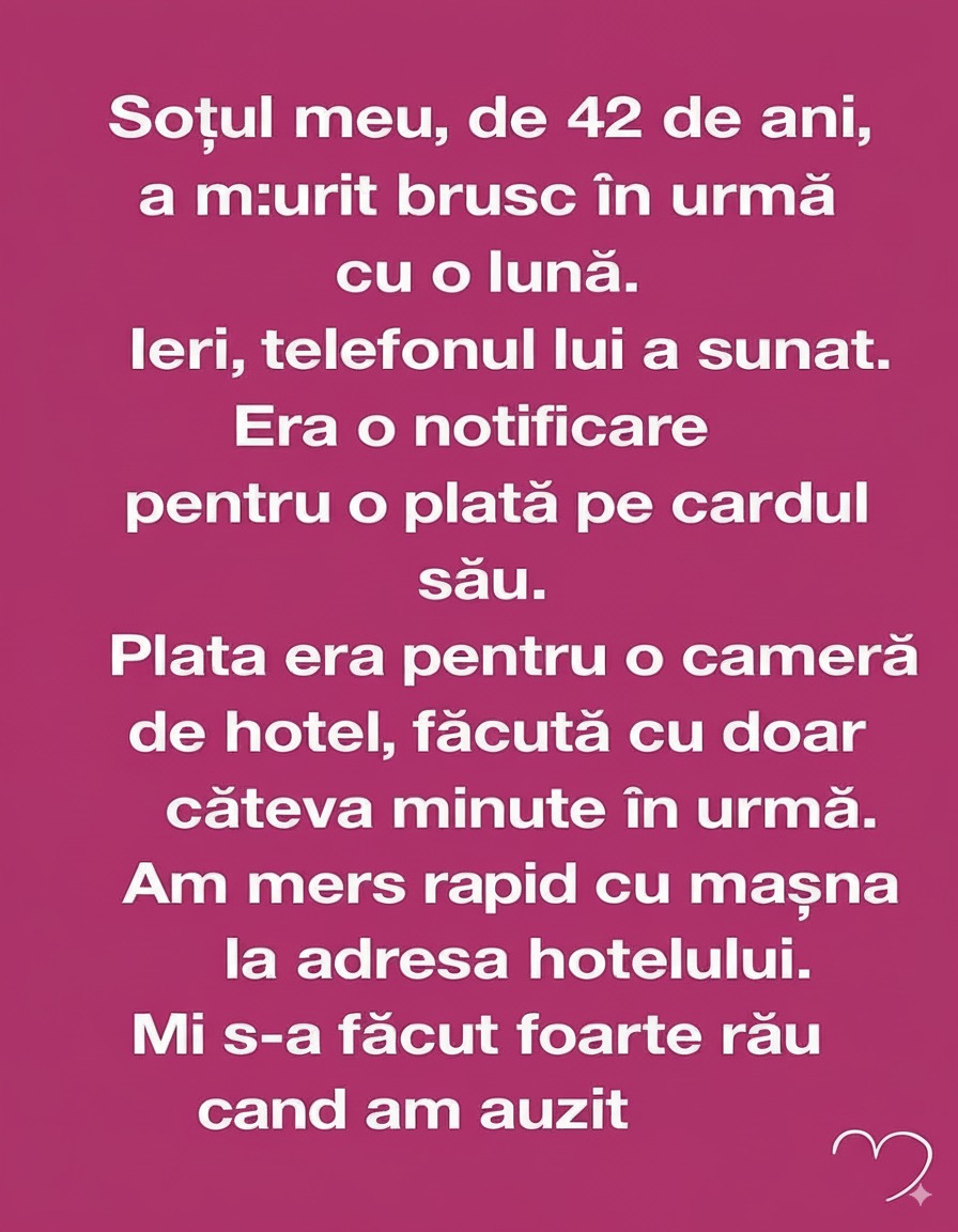 Nu am răspuns. Nu puteam. Mâinile îmi tremurau prea tare și eram prea preocupată să înțeleg cum cardul unui bărbat decedat putea să funcționeze, cu atât mai puțin să rezerve camere.