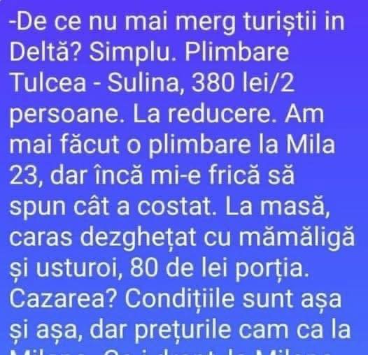 La reducere. Am mai făcut o plimbare la Mila 23, dar încă mi-e frică să spun cât a costat. La masă, caras dezghețat cu mămăligă și usturoi, 80 de lei porția.