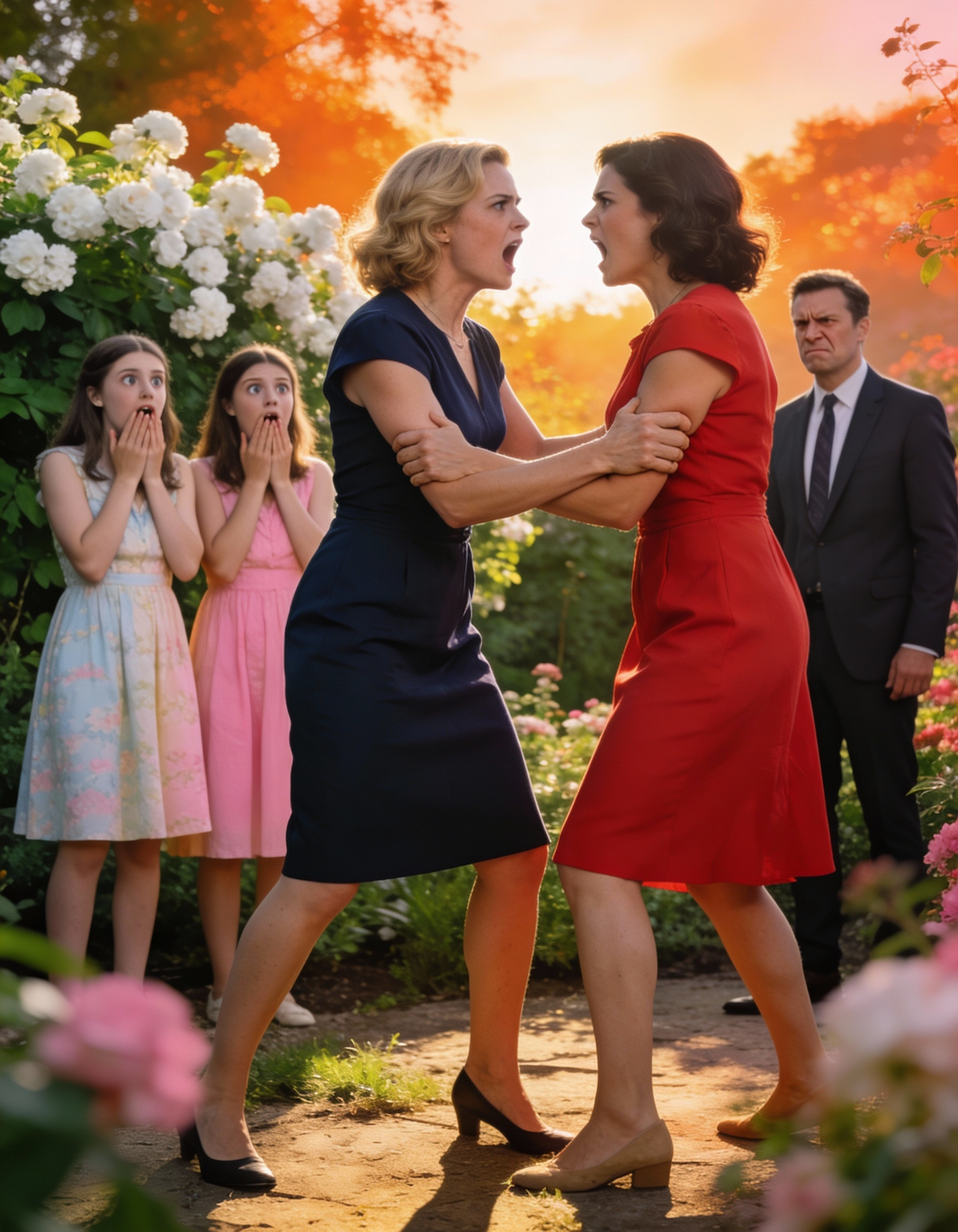 Aerul serii era greu, mirosea a flori de tei și a mâncare scumpă, iar dinspre sală se auzea un râs forțat. Totul părea fals, ca o scenă prost jucată.
